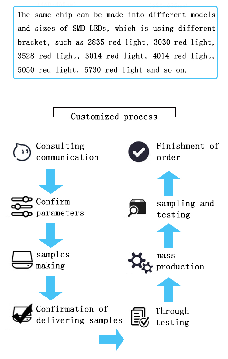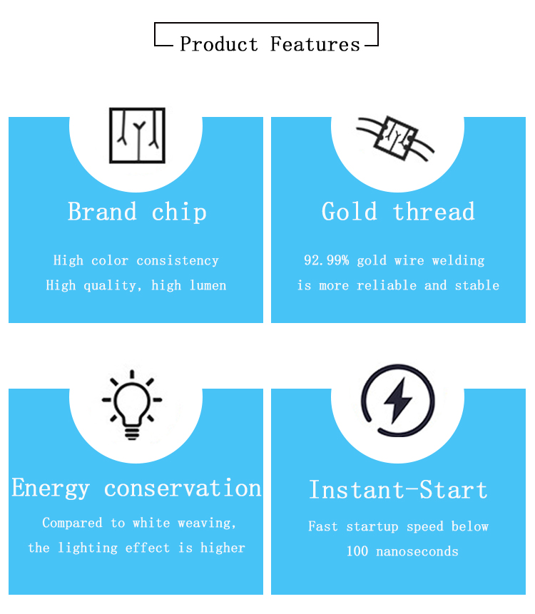 Emitting color  | Positive White/Warm White/Neutral White/Red Green Blue/UV Purple UV/IR Infrared/Amber/Ice Blue/Yellow Light  |